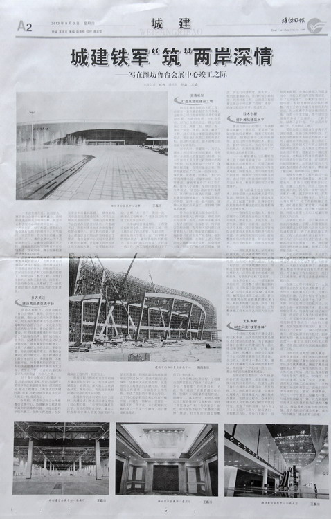 城建鐵軍“筑”兩岸深情——寫在濰坊魯臺(tái)會(huì)展中心竣工之際》——濰坊日?qǐng)?bào)2012年8月2日A2版